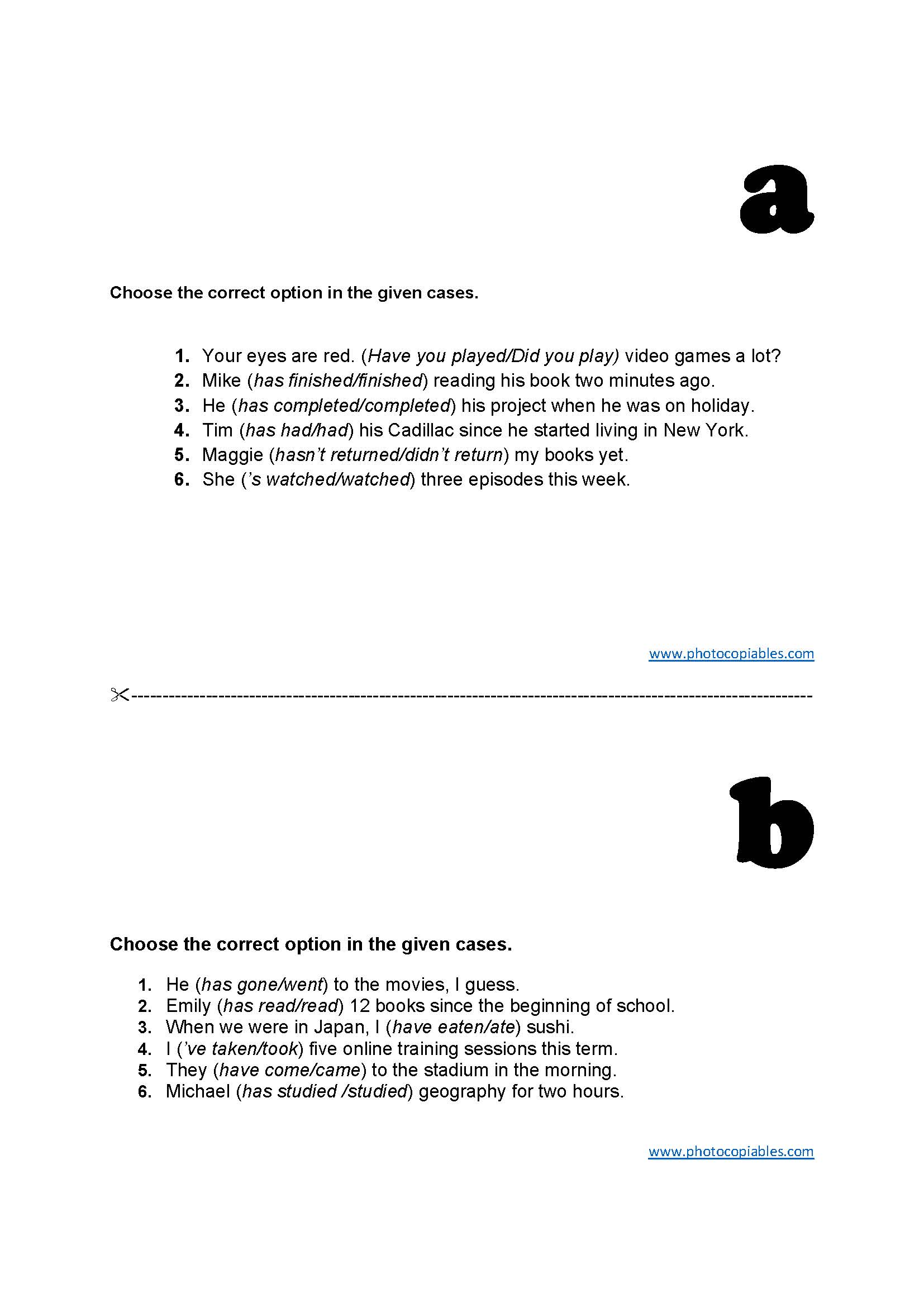 Here's a short exercise to consolidate Present Perfect and Past Simple tenses. There are a and b versions of the same exercise model. You can divide your class into two and give them separately. Then, your students should swap them to check others' worksheets.  It'll be great for increasing classroom interaction and your students will love checking their friends' worksheets. You can find the answer keys to the worksheets here