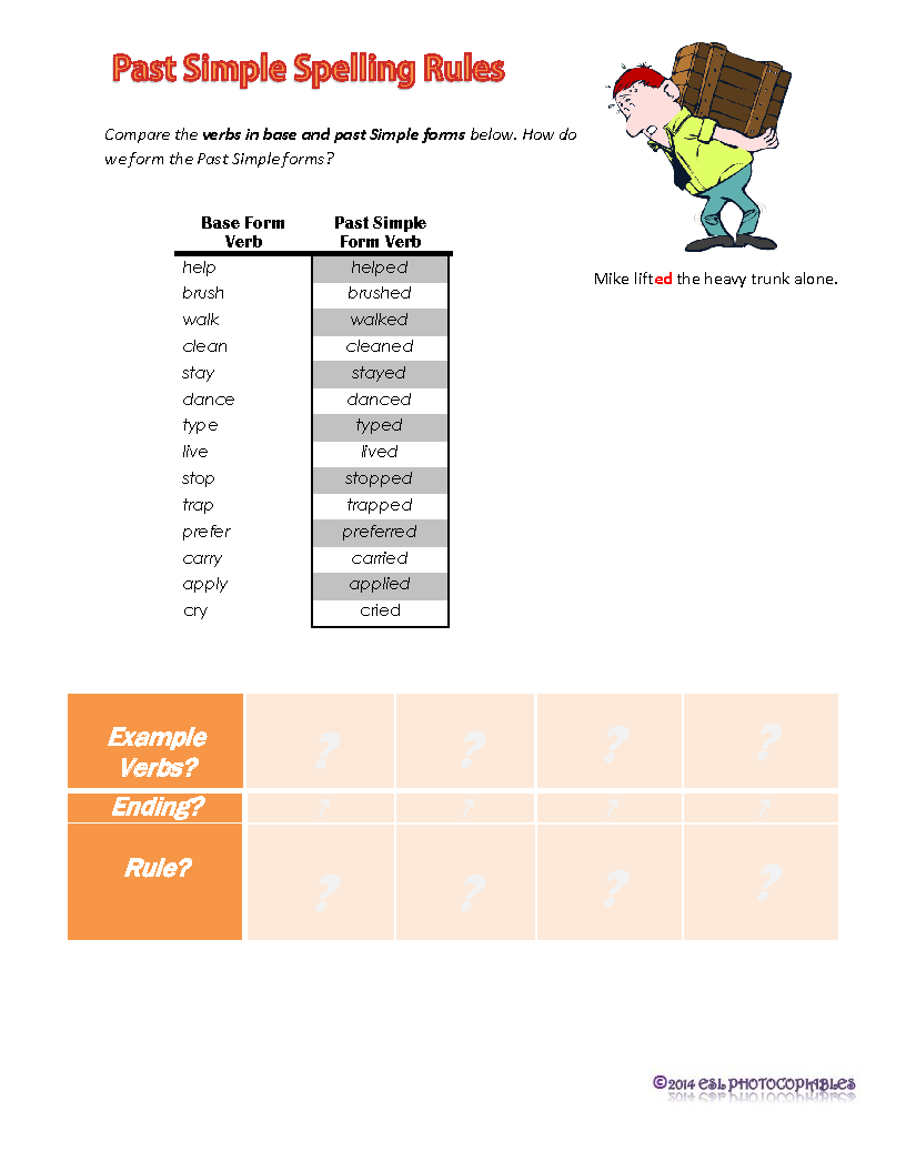 Esl lesson to teach spelling rules in Past Simple Tense regular verbs for your elementary English classes. This is a guided discovery lesson that will be great for hands-on learning.